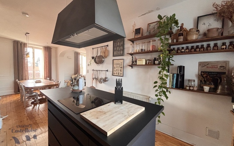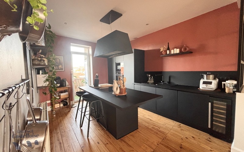 Cuisine HAUT DE GAMME IXINA toute équipée et ouverte avec son accès balcon pour déjeuner en extérieur.