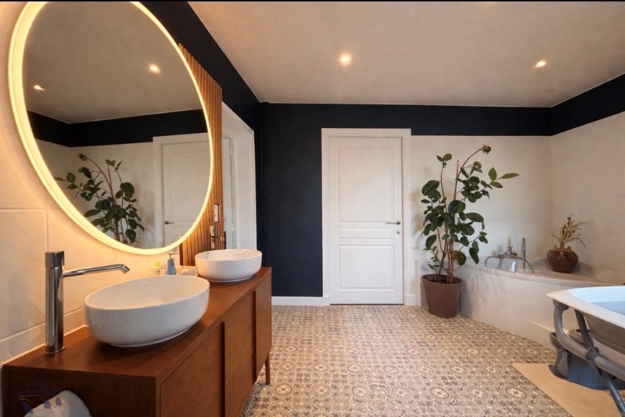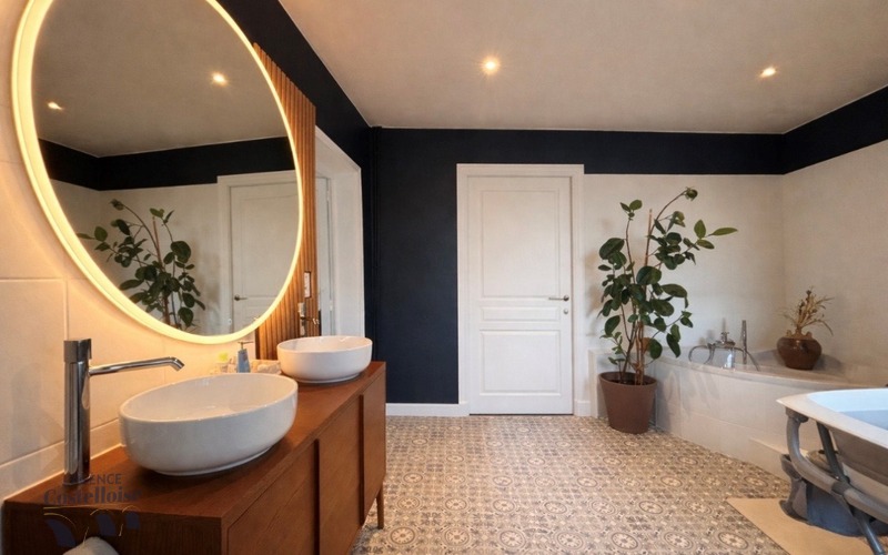 - Grande salle de bain avec douche italienne / baignoire d’angle et meuble double vasque