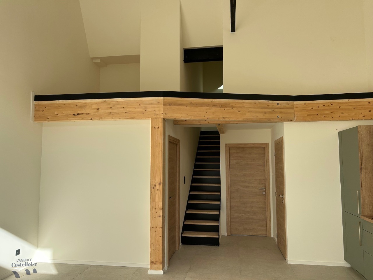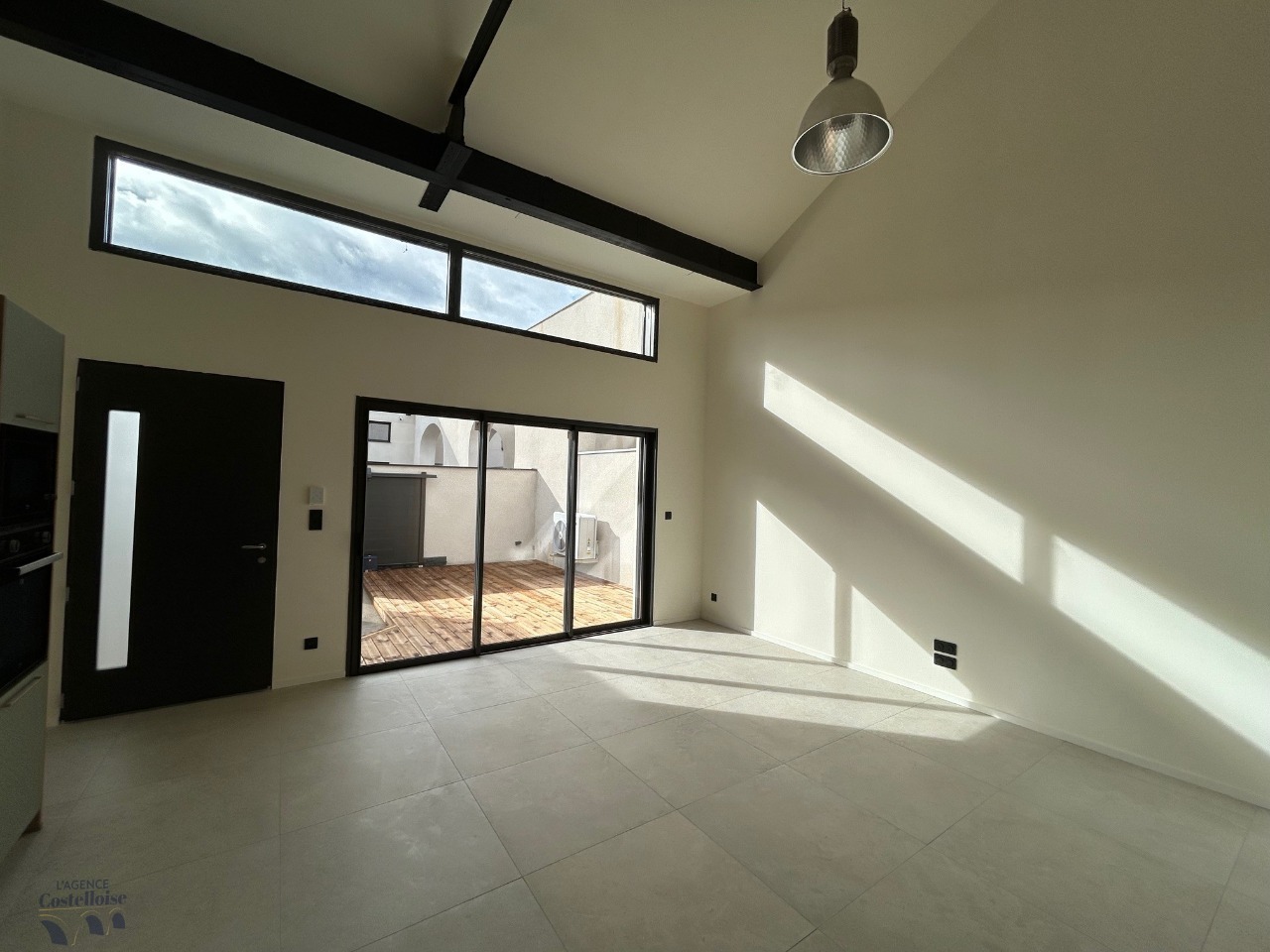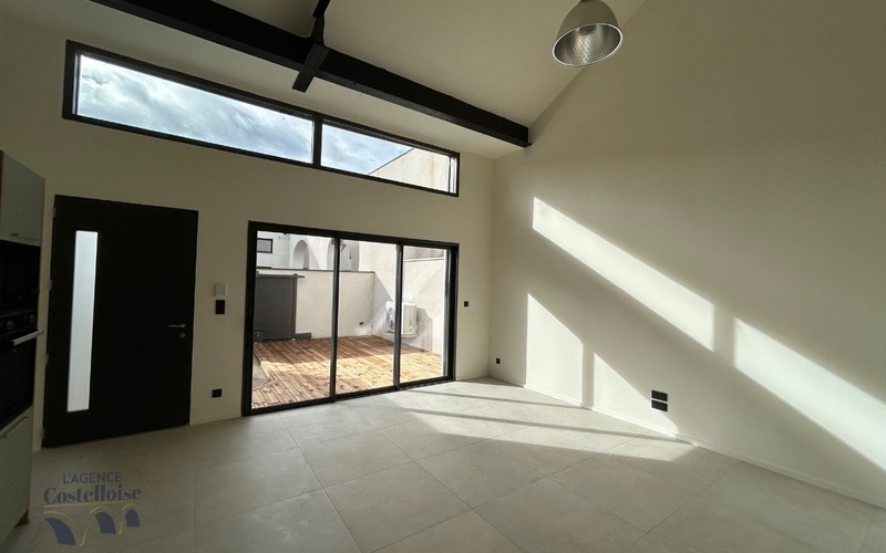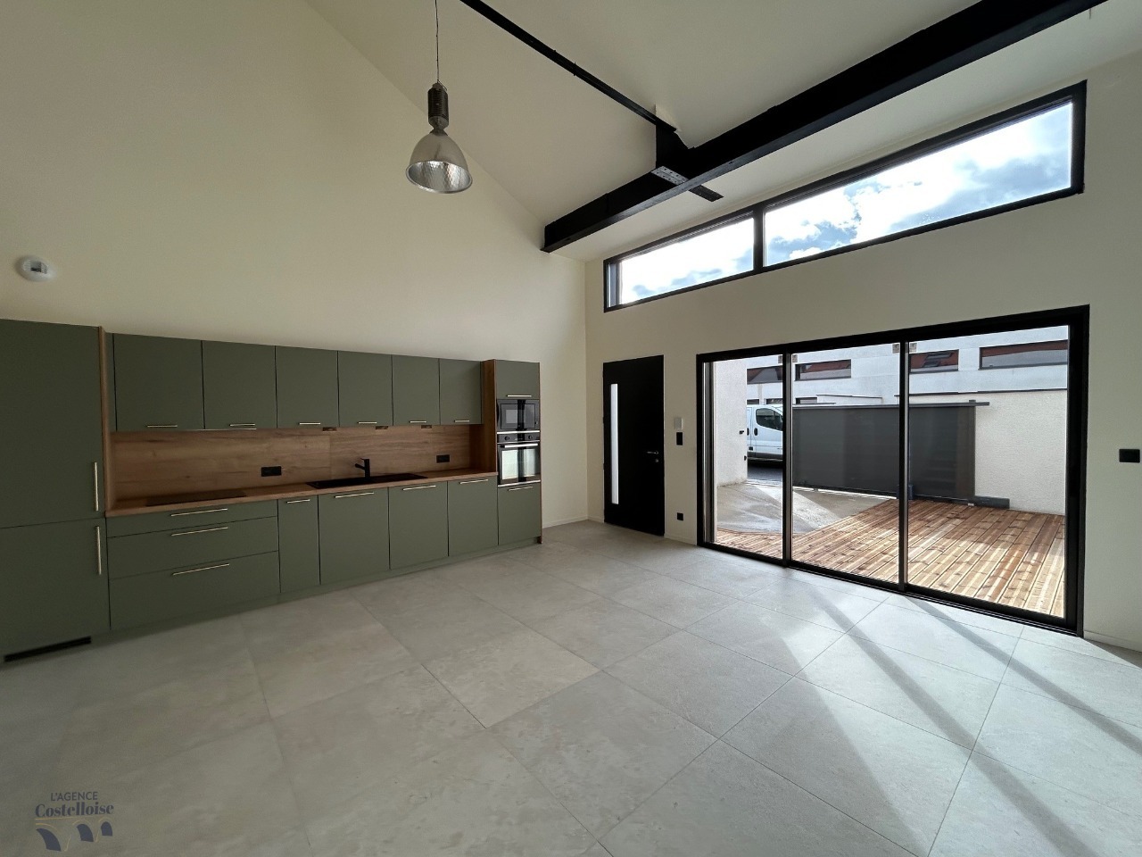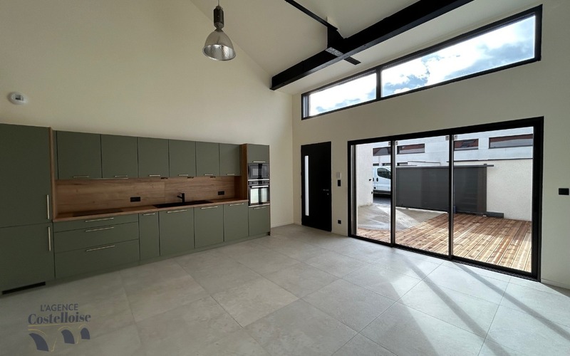 Dès l’entrée, la pièce de vie déplafonnée impressionne par sa luminosité et ses volumes généreux.