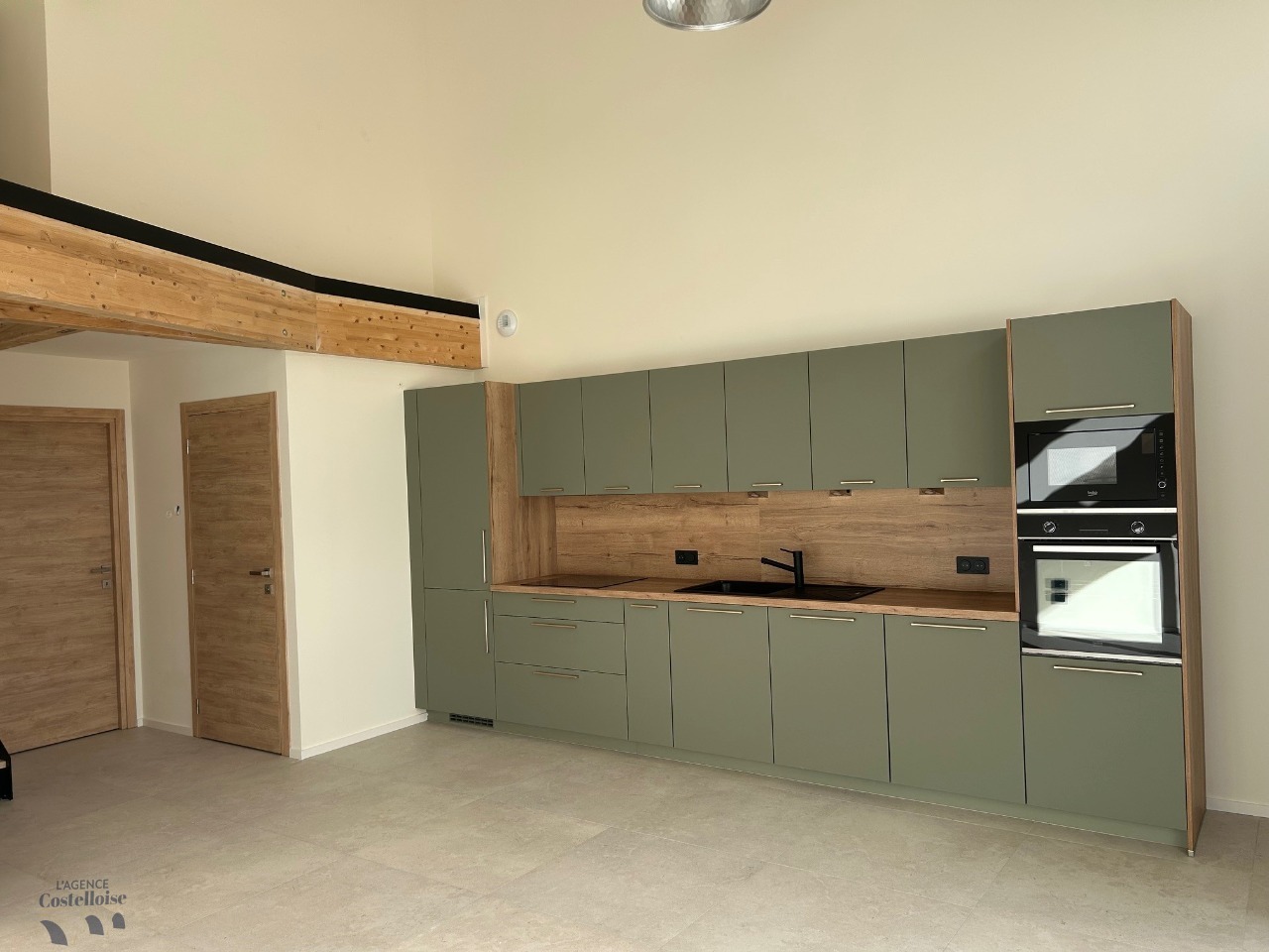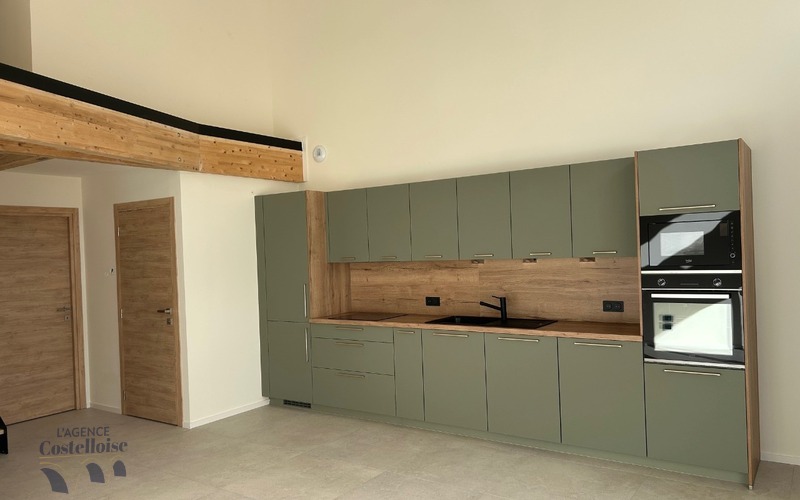 La cuisine ouverte, élégamment aménagée et entièrement équipée avec électroménagers, s’intègre harmonieusement à l’espace de réception.