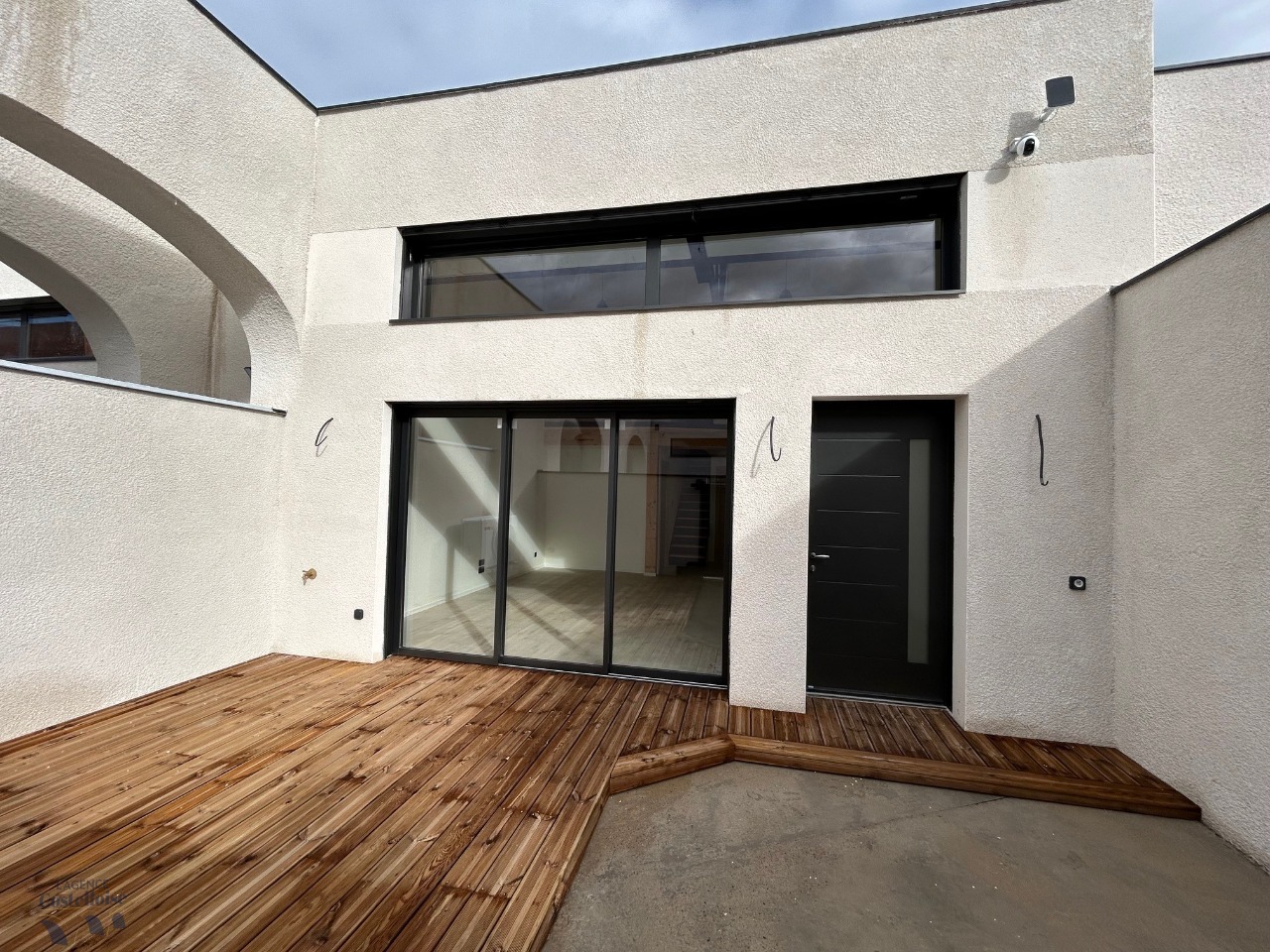 L’extérieur dévoile une belle terrasse en bois exotique pour profiter pleinement des beaux jours plein sud