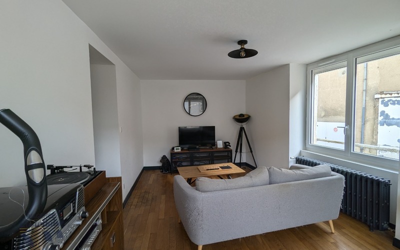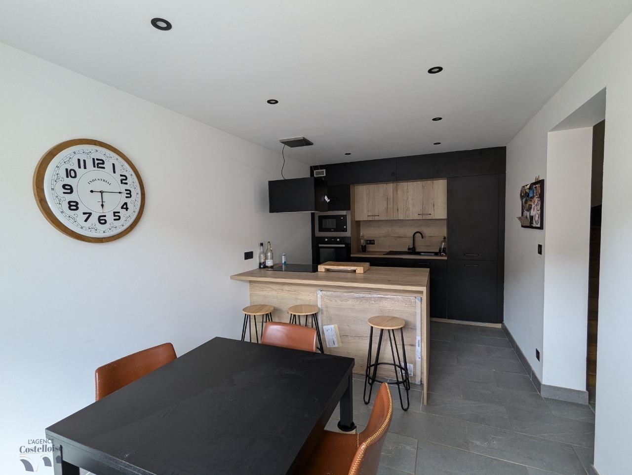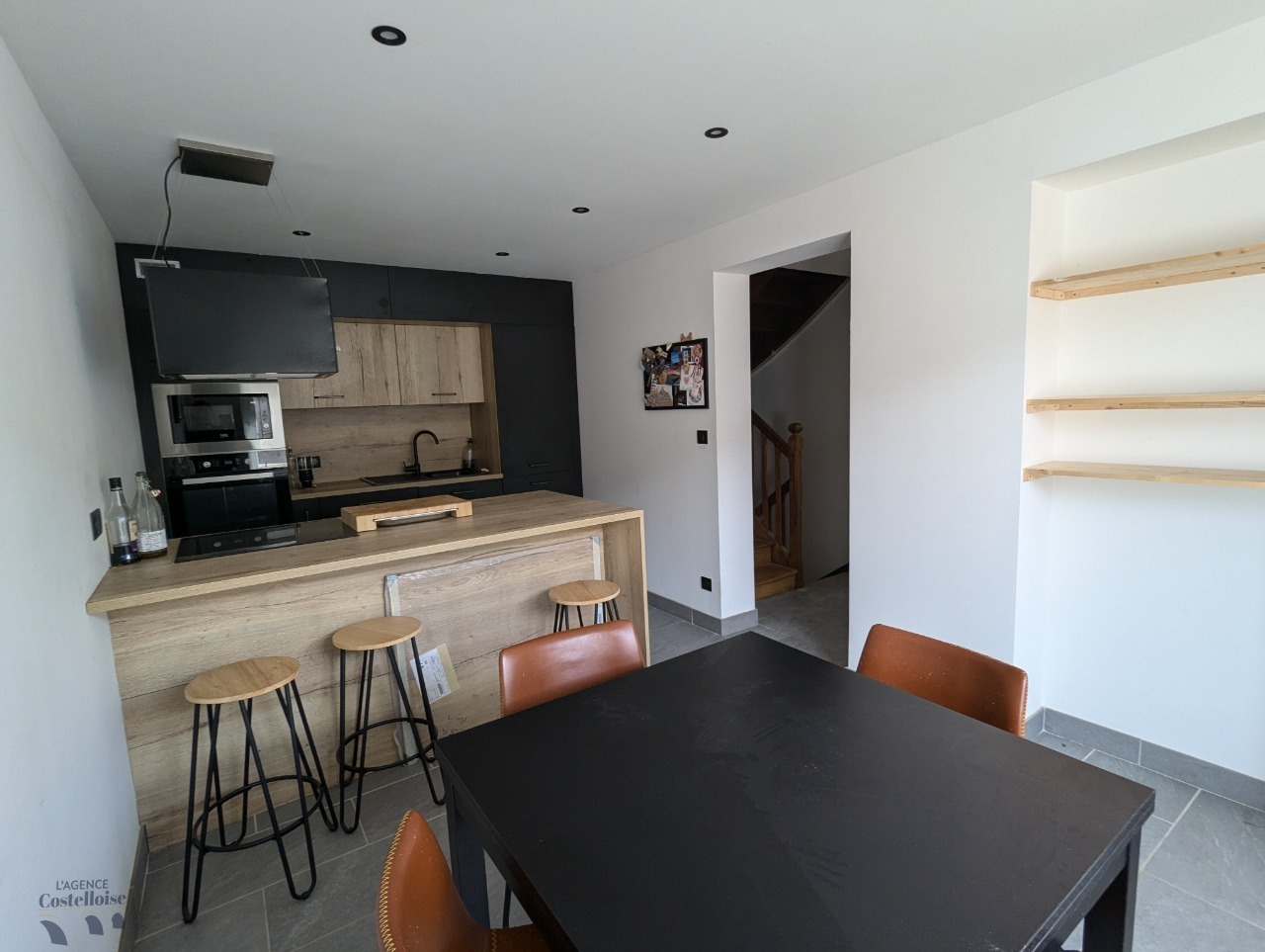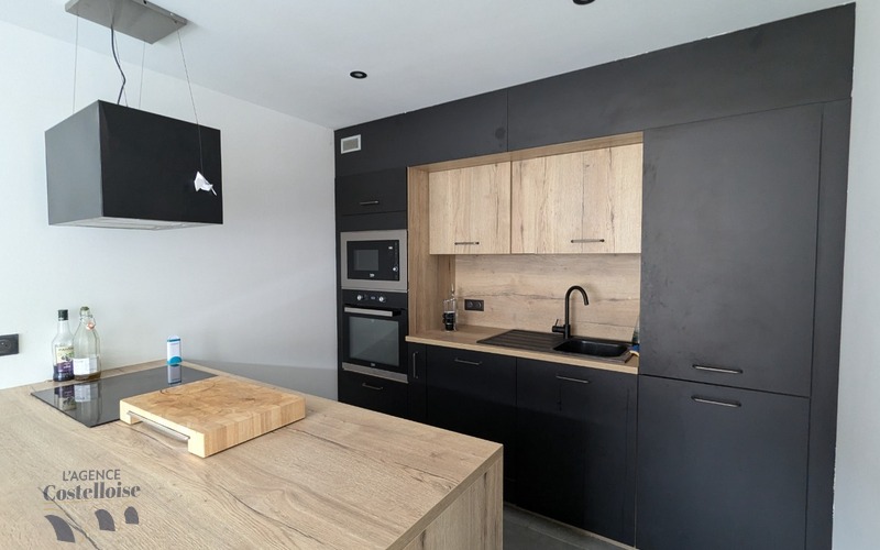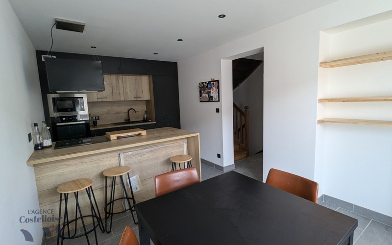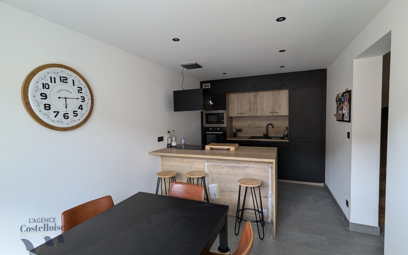A l’étage une cuisine équipée contemporaine avec son espace dinatoire, un séjour salon très lumineux