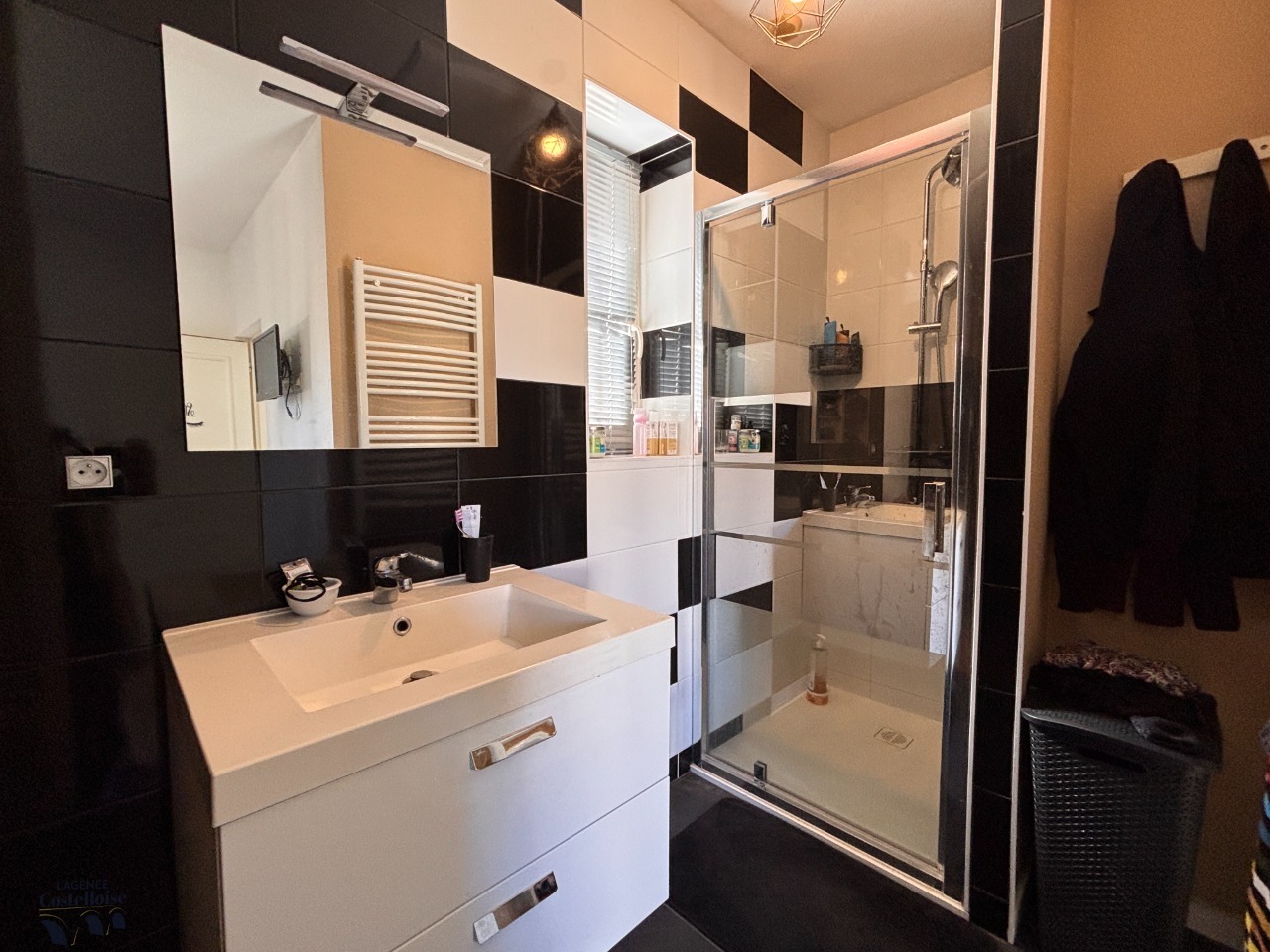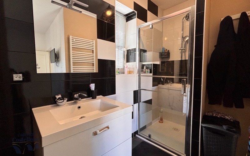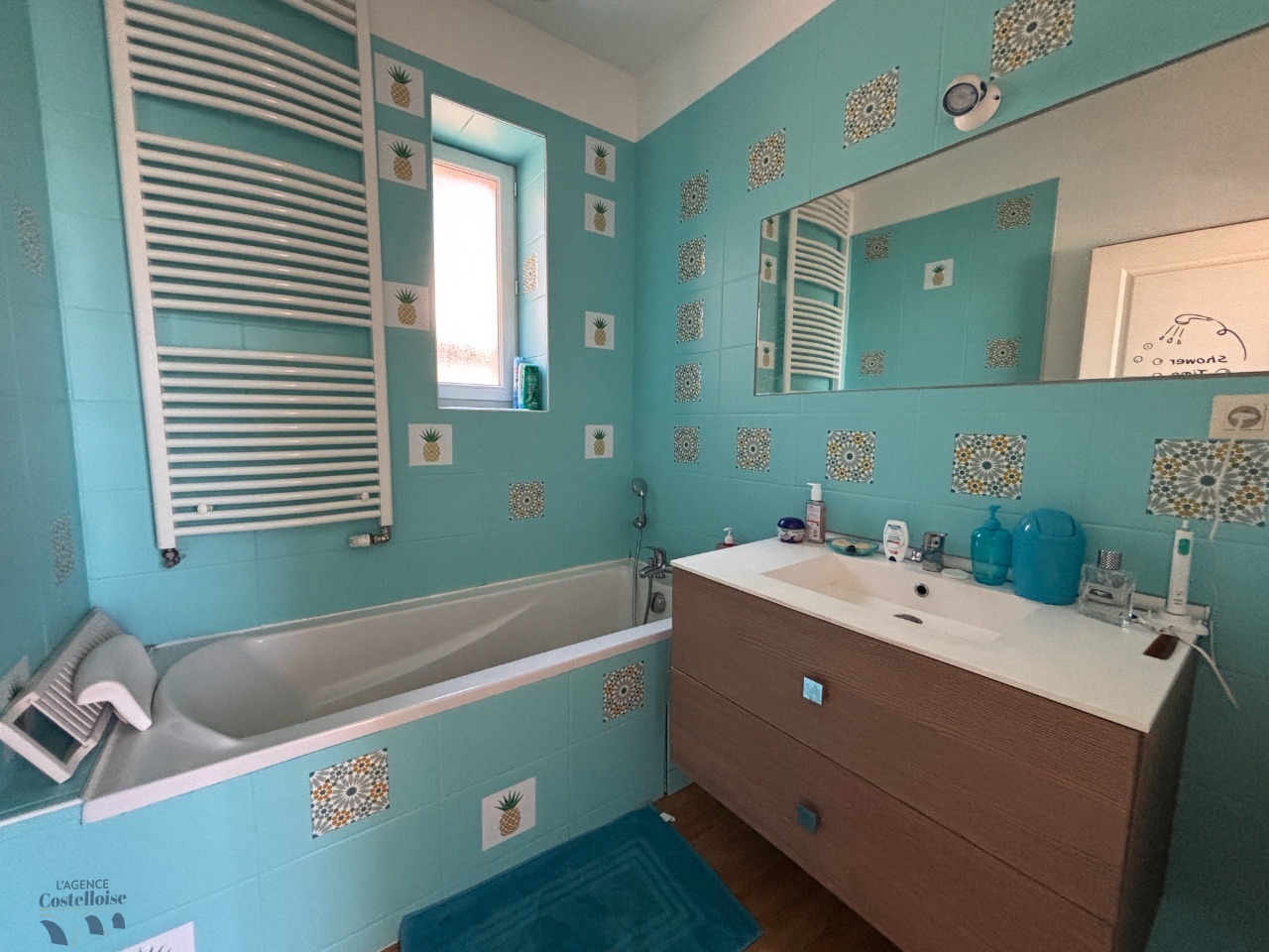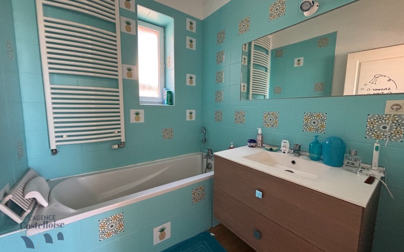 - Salle de bain avec baignoire, meuble vasque et rangements.