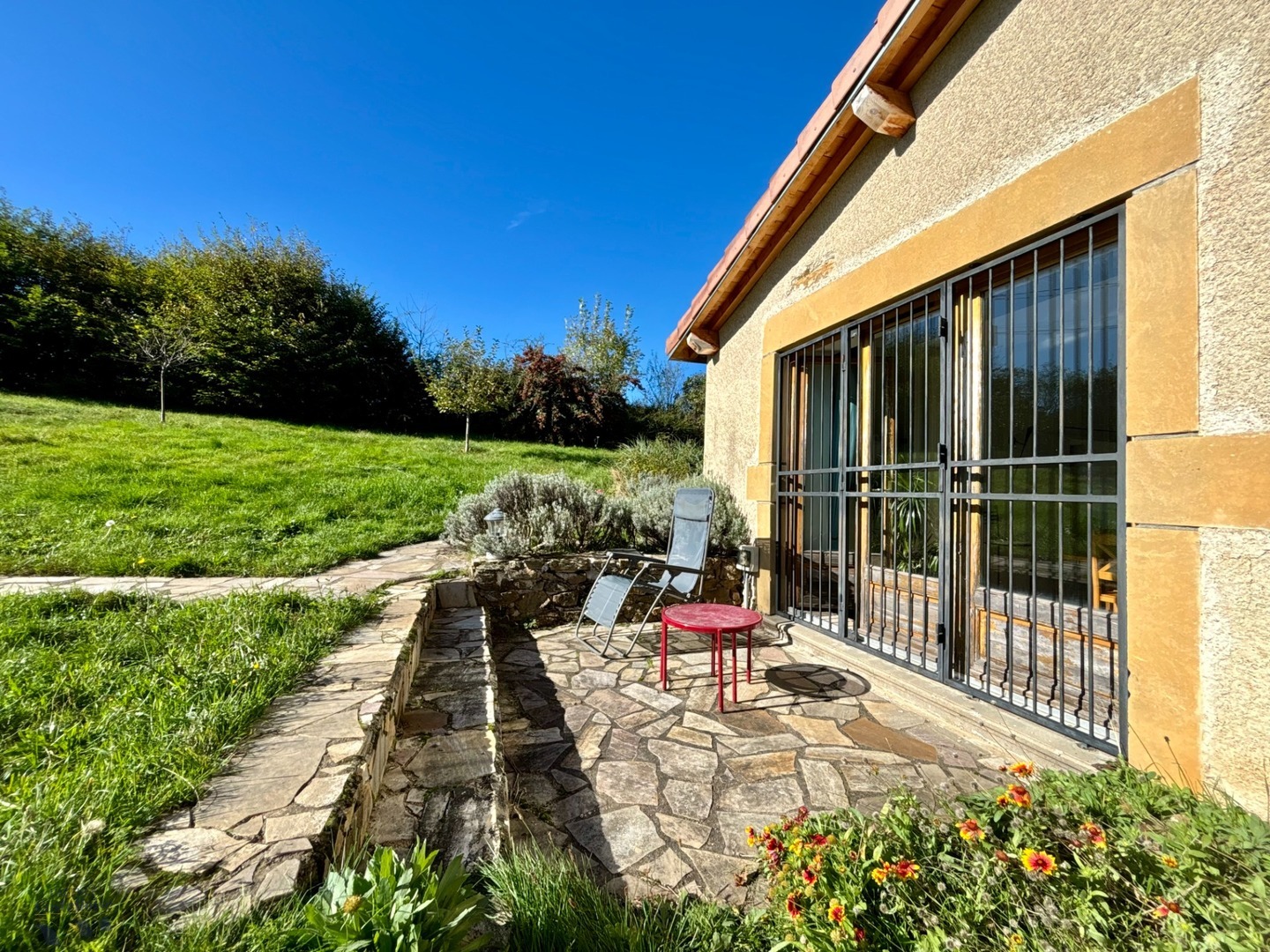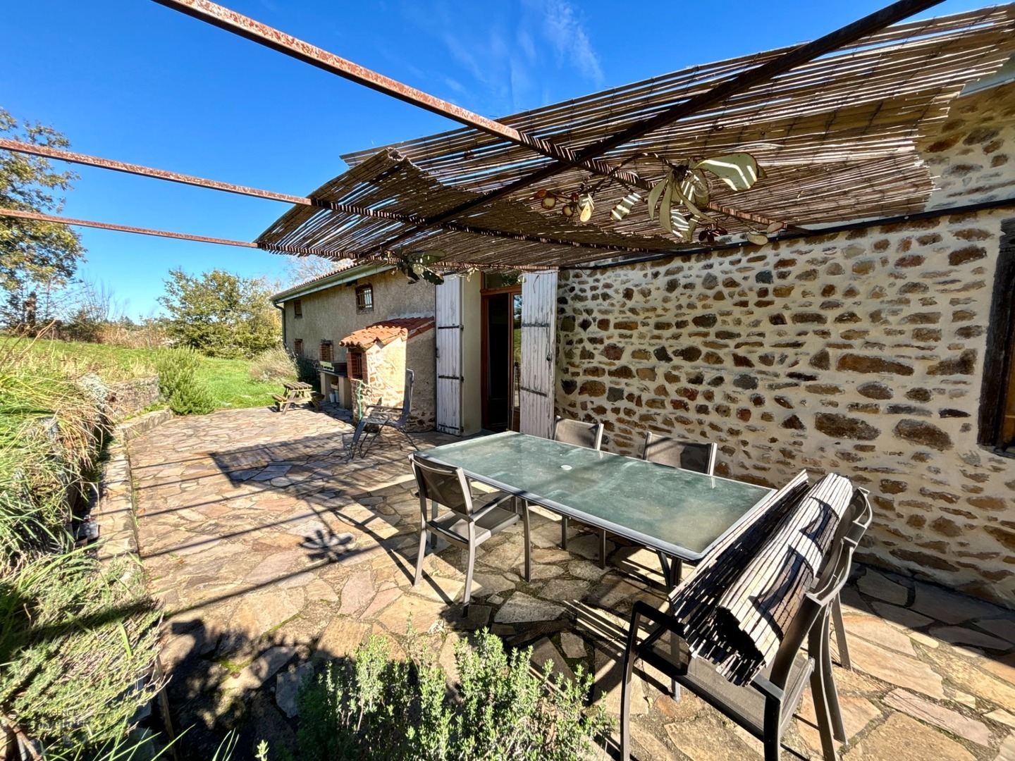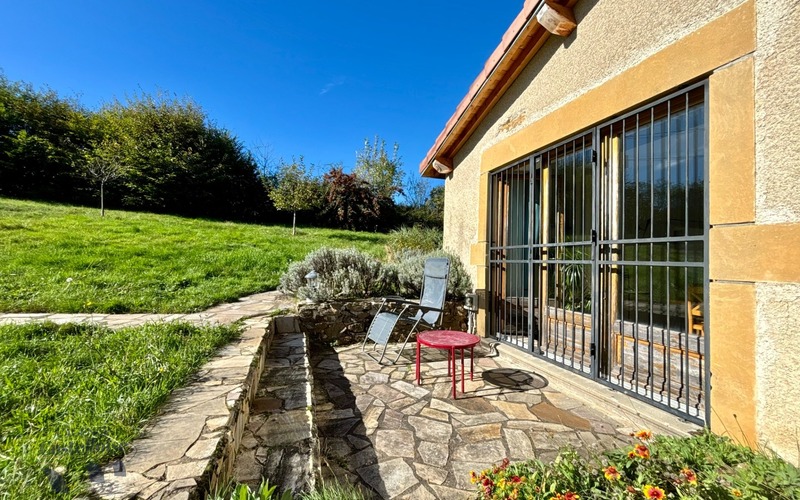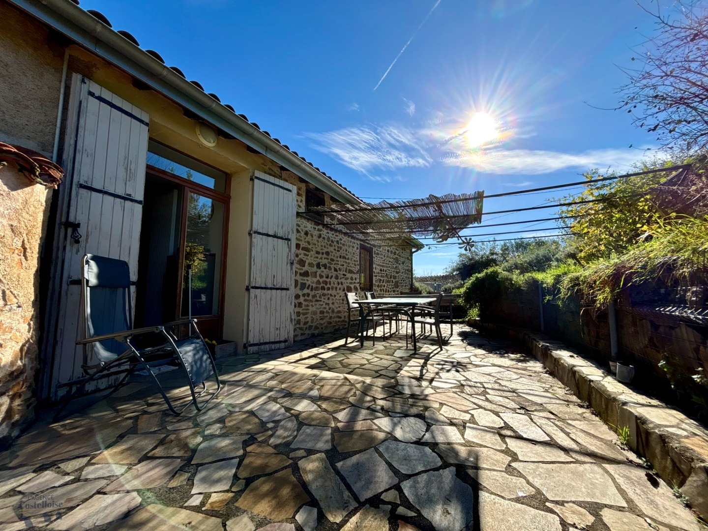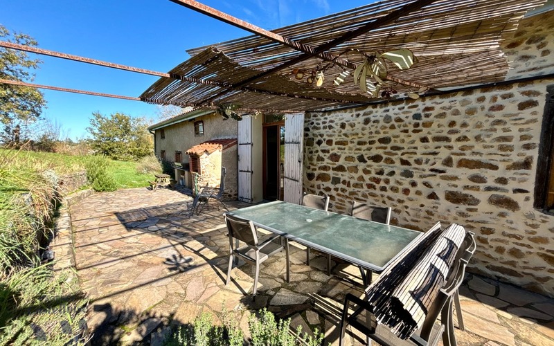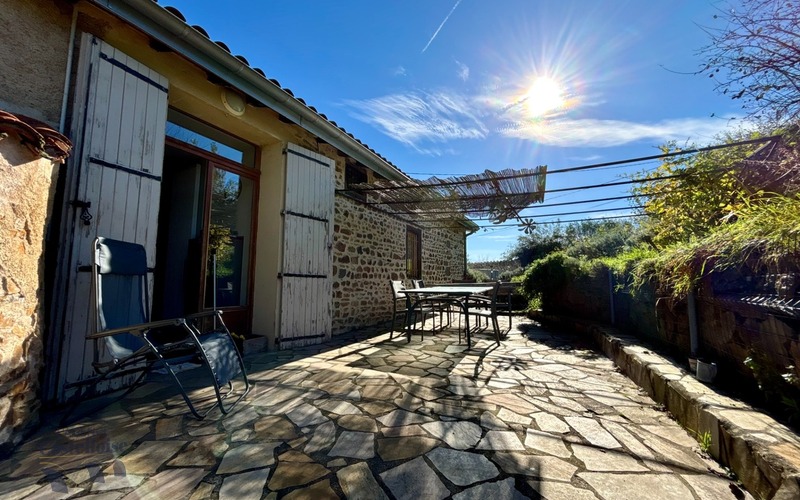 Côté extérieur, une grande terrasse dallée en pierres, orientée sud-ouest pour profiter des repas avec son accès directe dans la cuisine.