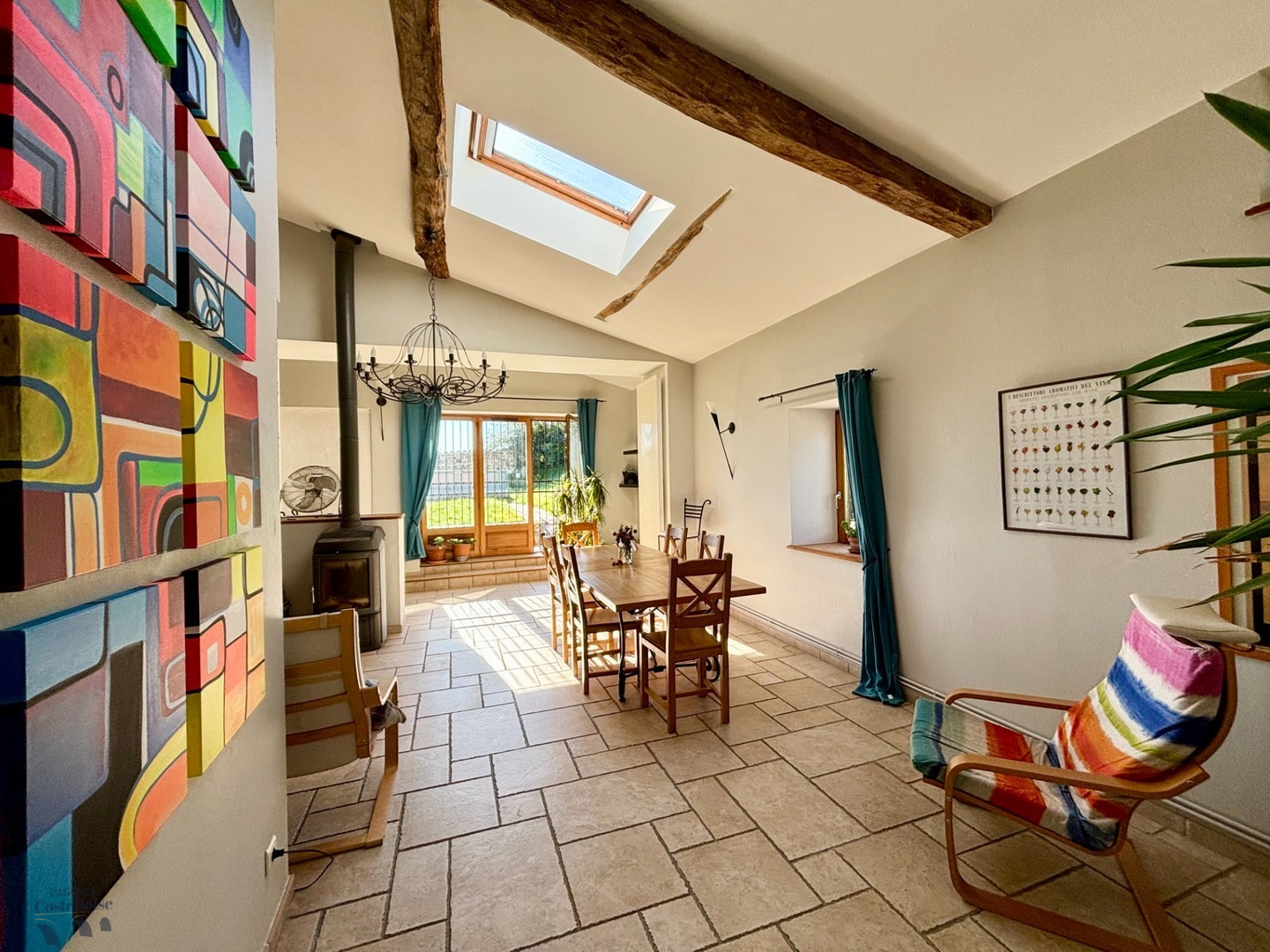 En effet, de plain-pied on trouve un vaste hall d’entrée qui dessert un premier salon cocooning avec sa cheminée, puis vous découvrirez une grande cuisine équipée pour les amateurs de cuisine avec son ilot central, le séjour avec son poêle à bois et sa belle hauteur sous plafond avec un puits de lumière...Et indépendamment un 2ème salon télé ou lecture...